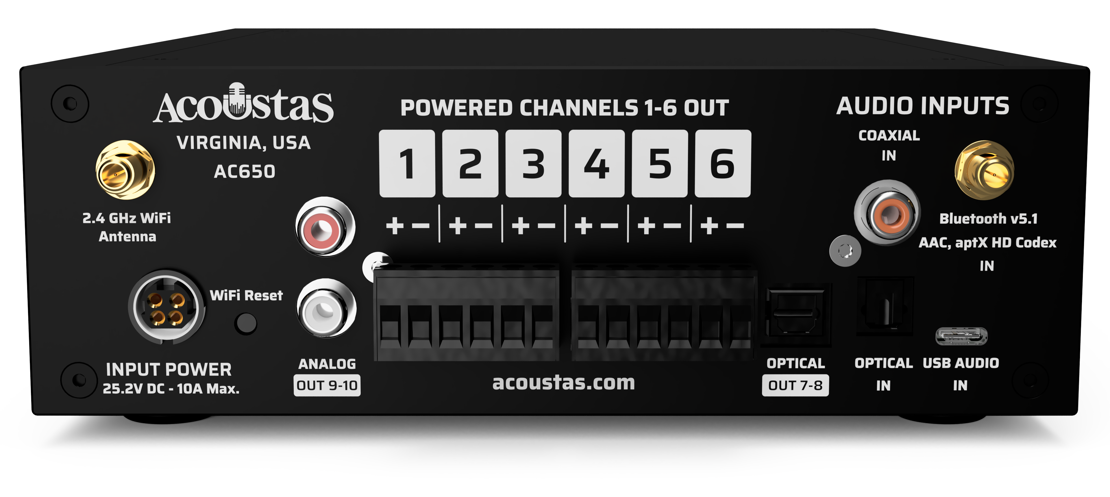 The AC650 is a DSP amplifier with 10 addressable channels. It features 6 powered channels, 54 Watts max per channel, along with 2 RCA outputs and 2 optical outputs for external amplification, subwoofers and system expansion.
