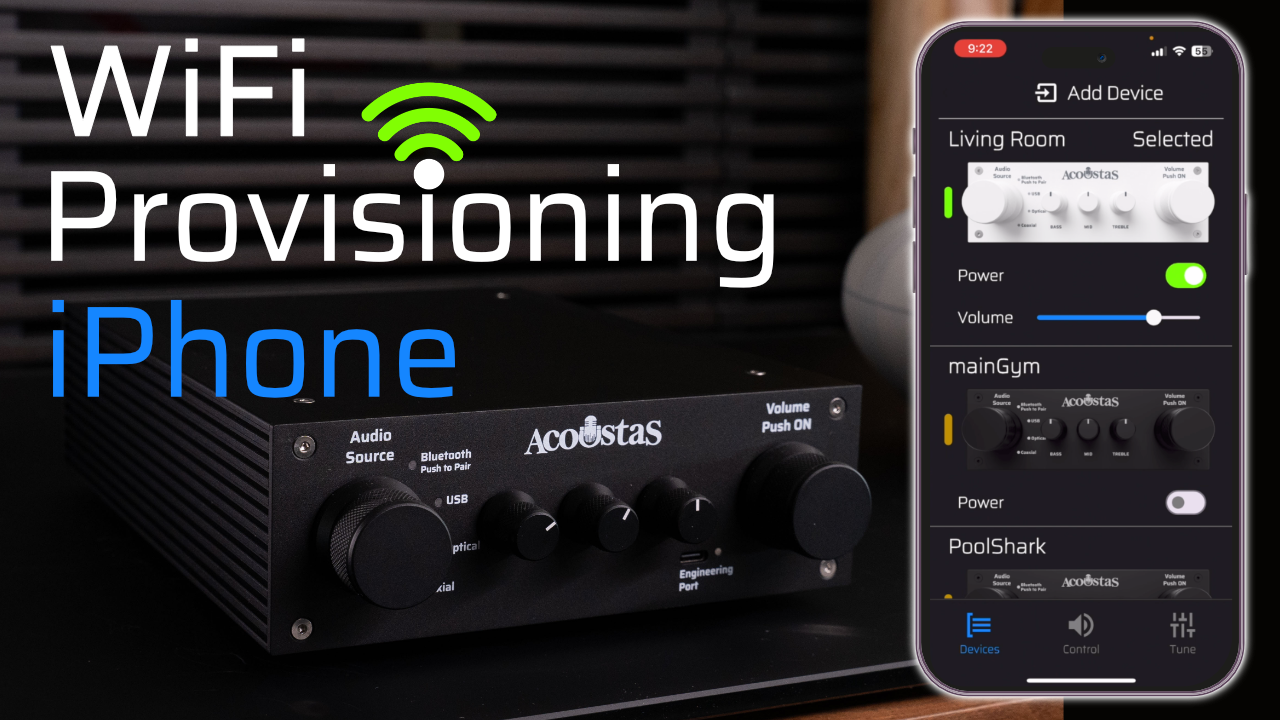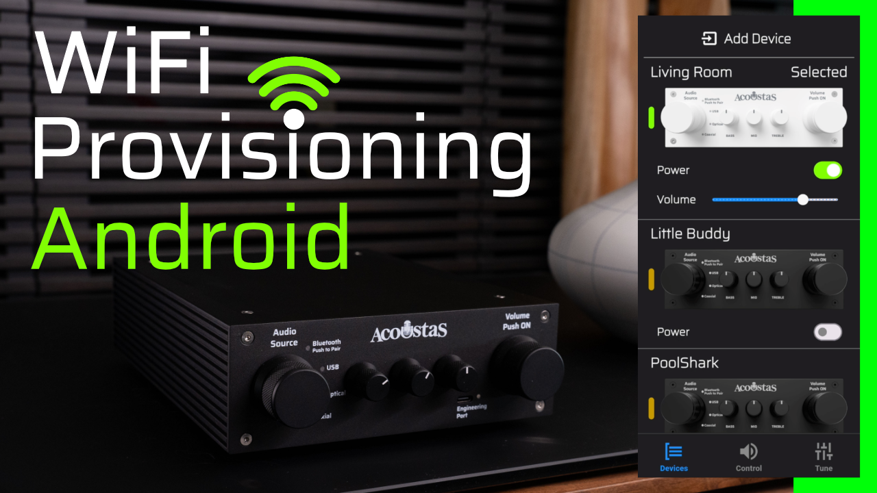 To connect the Acoustas device to your Wi-Fi network, you need to provision it. This is a one-time process unless you change the WiFi details. Once provisioned, you can control and tune the device via the Acoustas App on the same network.