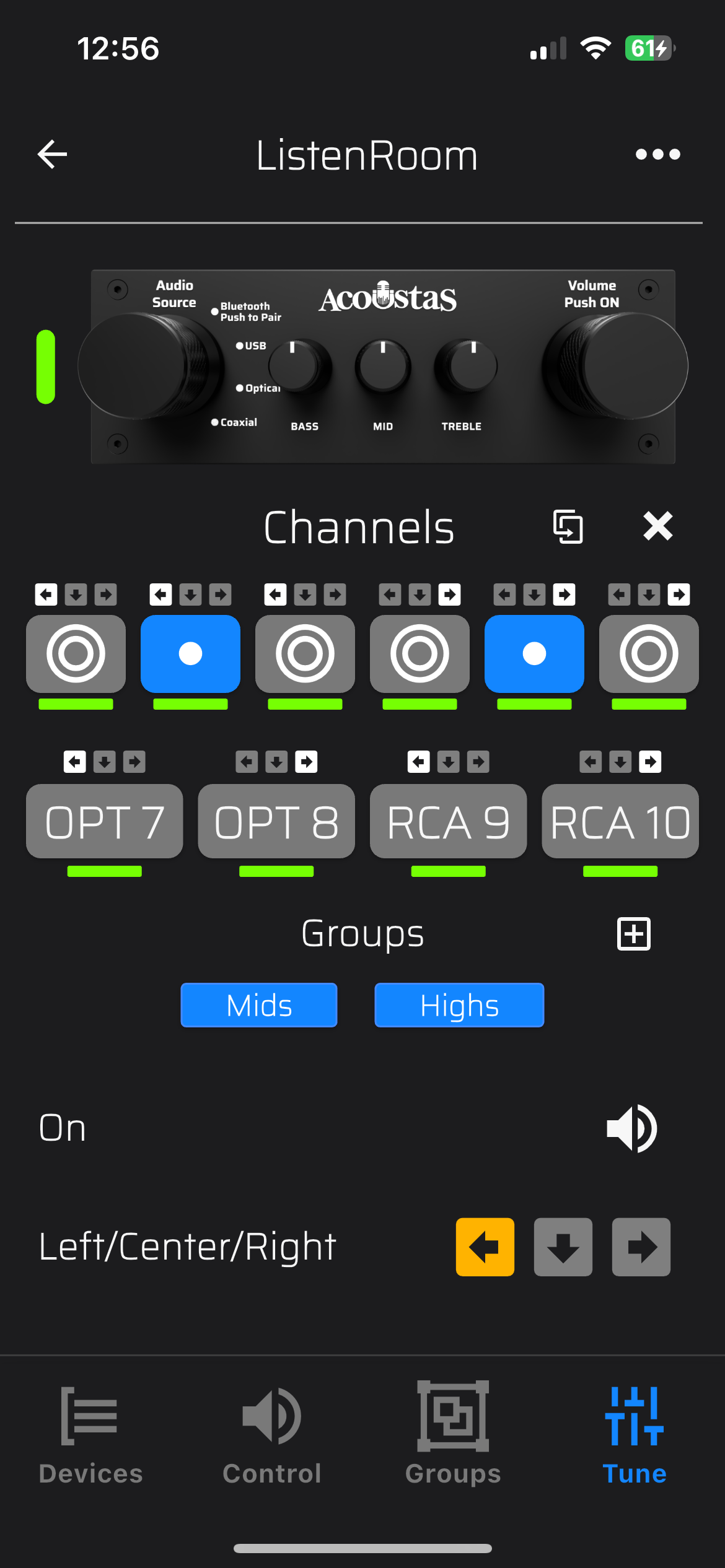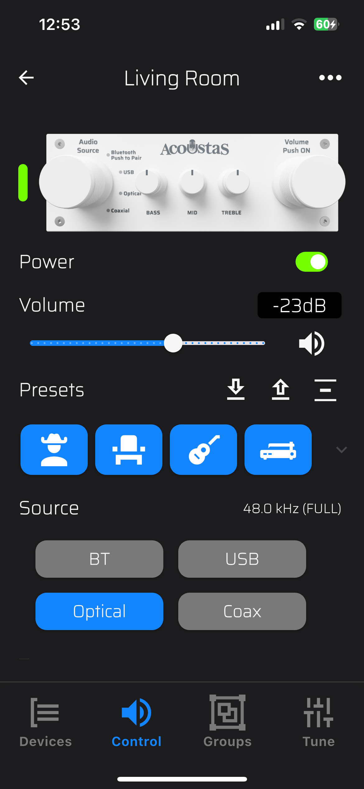 The Acoustas App is a powerful and intuitive control and tune hub for Acoustas devices. Accessible anytime over your local Wi-Fi network, it's ready at a moment’s notice to handle everything from quick volume tweaks to complex multi-channel DSP adjustments—instantly and effortlessly.